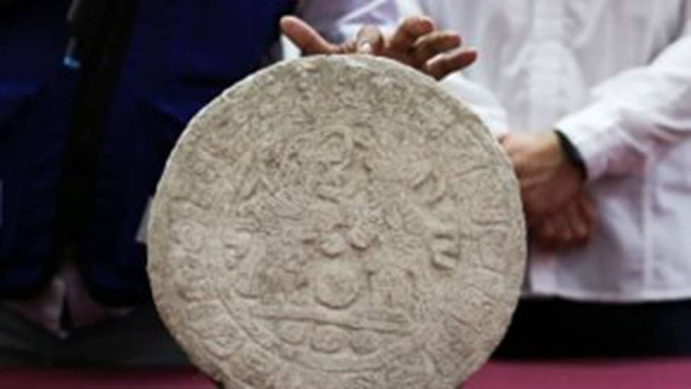 The circular piece, measuring just over 32 centimetres in diameter and weighing 40 kilograms displays hieroglyphic writing surrounding two players standing next to a ball that was discovered on this site.