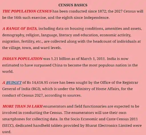 - India’s 2027 Census will introduce several firsts, including digital enumeration, self-enumeration, and caste counting after 1931.