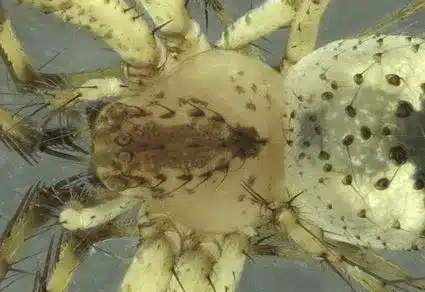 • Mimetus spinatus is characterised by its medium size, pale yellow head, and dull grey-white abdomen, with scattered light green mottling. It possesses long, black, flattened spine-like hairs on the dorsal head, which inspired its name.