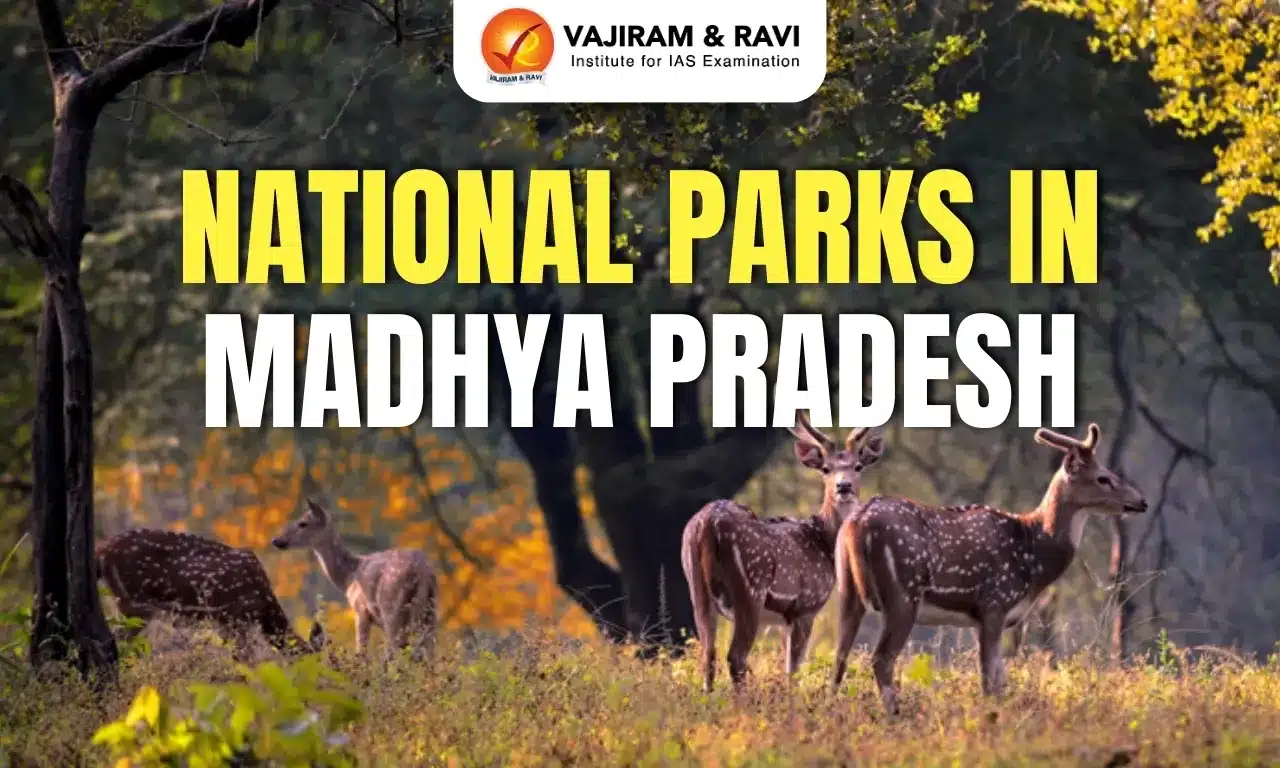 Madhya Pradesh hosts 11 National Parks, making it a biodiversity stronghold in central India. These parks span the Vindhya, Satpura, and Maikal ranges and protect forests, grasslands, wetlands, and fossil beds. They support Bengal tigers, leopards, barasingha, gharials, rare birds, and prehistoric fossils. The parks play a vital role in wildlife conservation, ecological connectivity, climate regulation, and eco-tourism, contributing significantly to India’s tiger population and protected area-based livelihoods.