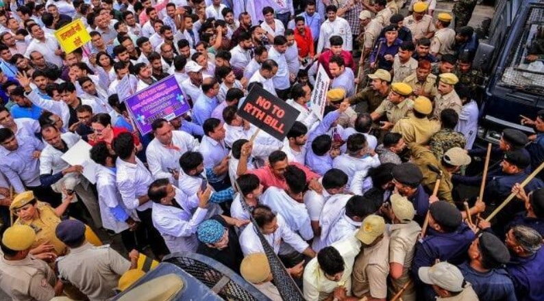 - Thousands of doctors took to the streets in Rajasthan Monday to protest against the Right to Health Bill, hitting healthcare services across the state.