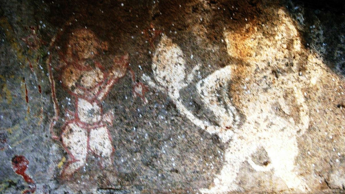 - A Ramayana fresco depicting Hanuman lifting the Sanjeevani hill with his right hand painted A conch and fire altars can be seen to his right and another prehistoric painting to the left.