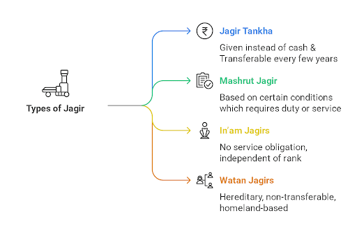Jagirdari system generally had four revenue assignments: Jagir Tankha, Mashrut Jagir, In’am Jagirs, and Watan Jagirs. The types are as follows: